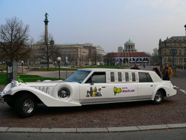 Eine Excalibur Stretchlimousine als Promotionfahrzeug für drachi.net.